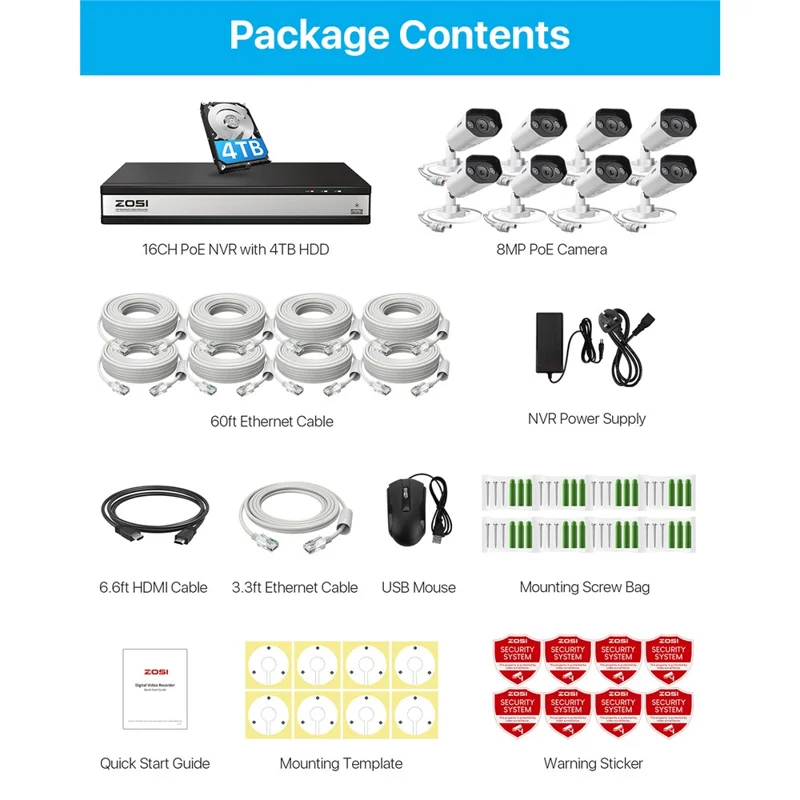 【Expandable 24-Channel System】Easily upgrade from 16 to 24 channels by adding a PoE switch (not included). Compatible with various ZOSI PoE cameras (8MP, 5MP, 4MP, or 3MP) for enhanced surveillance capabilities.