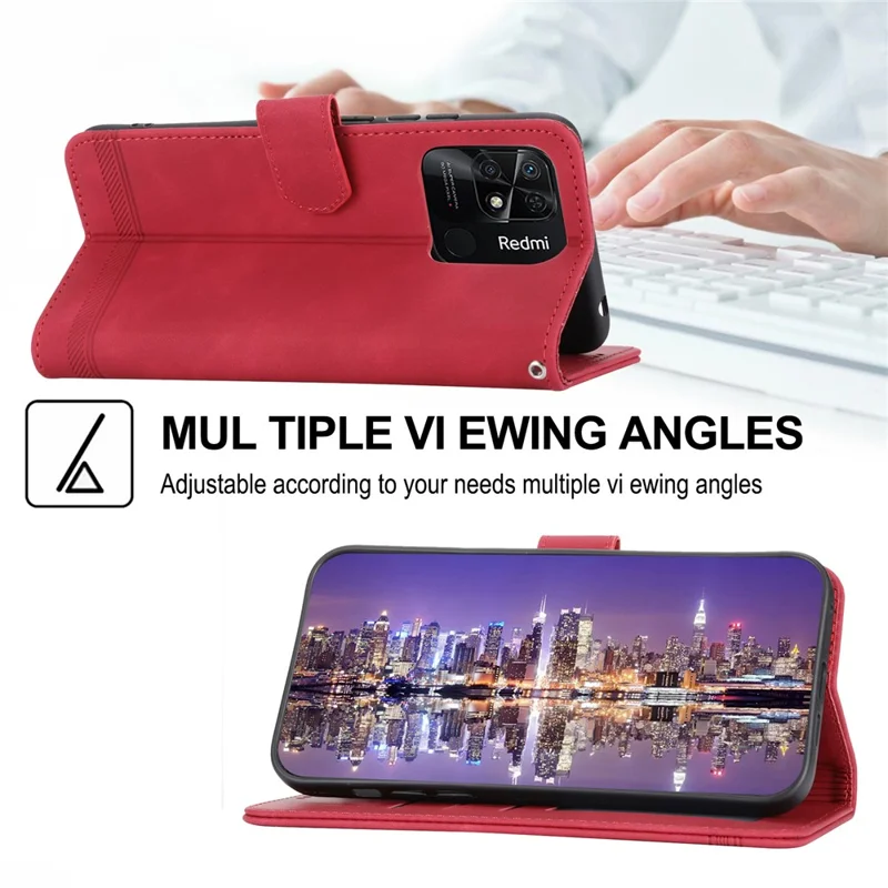 DIERFENG DF-03 for Xiaomi Redmi 10C 4G Phone Wallet Case Lines Imprinted Stand PU Leather Protective Phone Cover - Red