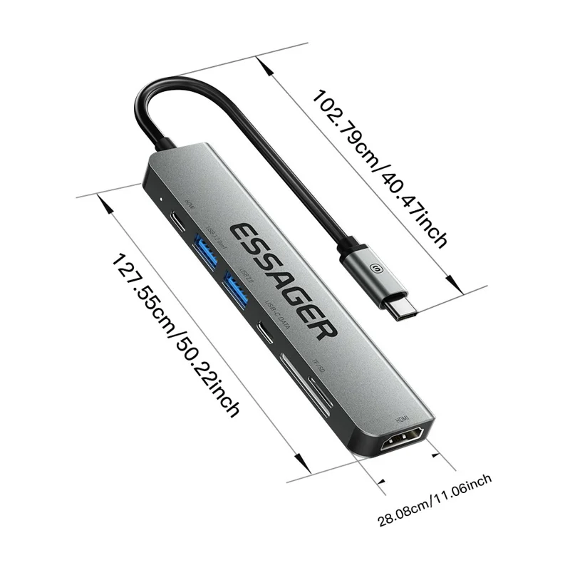 ESSAGER Type-C Hub Converter to PD 60W Fast Charging+Type-C Data Port+USB 3.2+USB 2.0+HD Video Output+2 Card Reader Slots