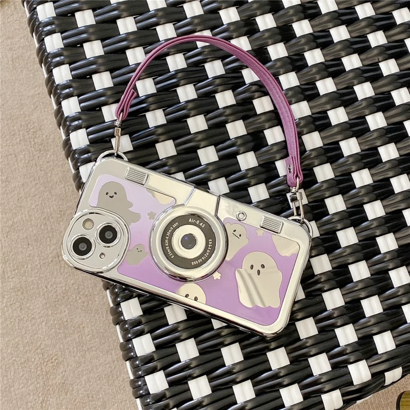 For iPhone 14 Cover Camera Design Mirror Effect Cute Ghost TPU Phone Case with Strap