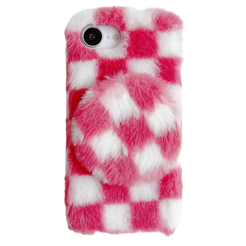 For iPhone 16e Fluffy Case Checkered Pattern Winter Plush Inner TPU Phone Cover with Mirror - Pink