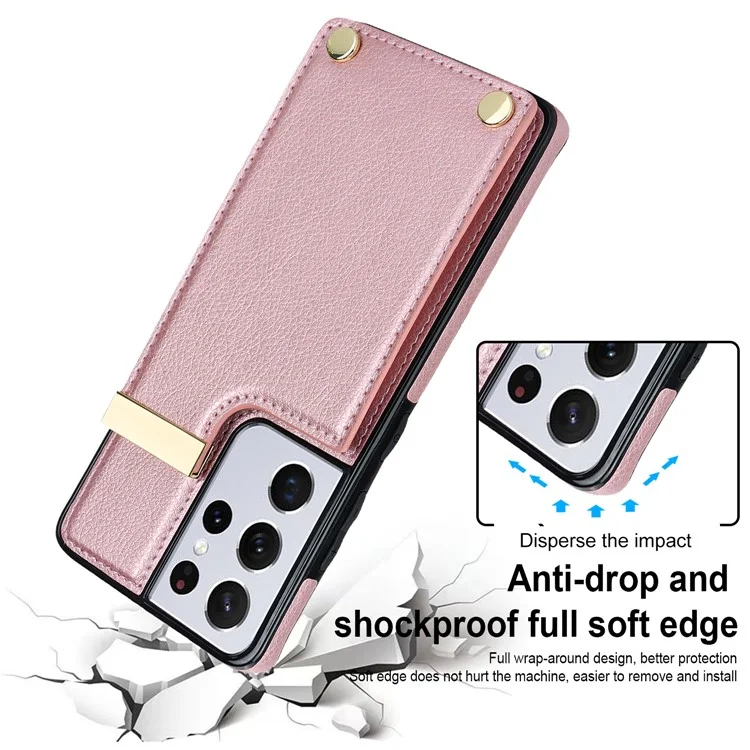 For Samsung Galaxy S21 Ultra 5G Case Shockproof TPU+PU Leather+Metal Hardware Phone Back Shell - Rose Gold