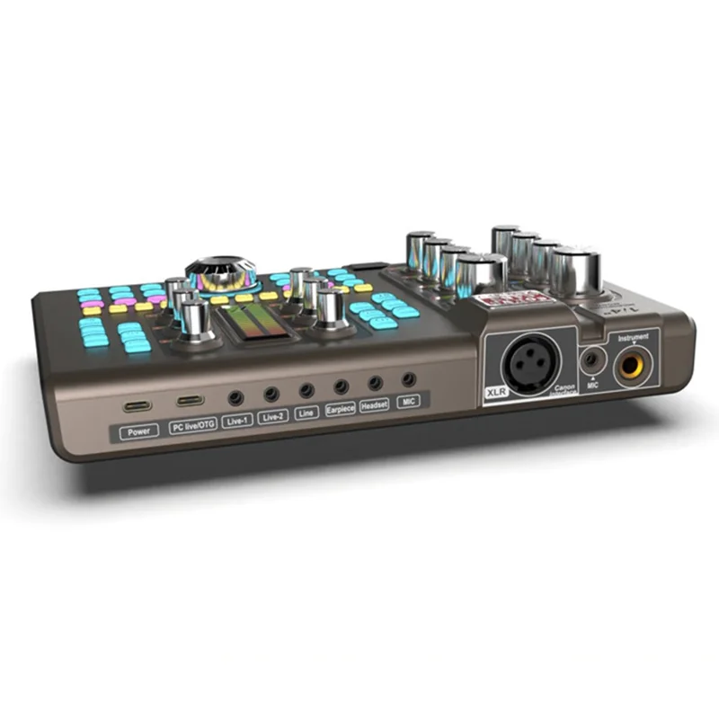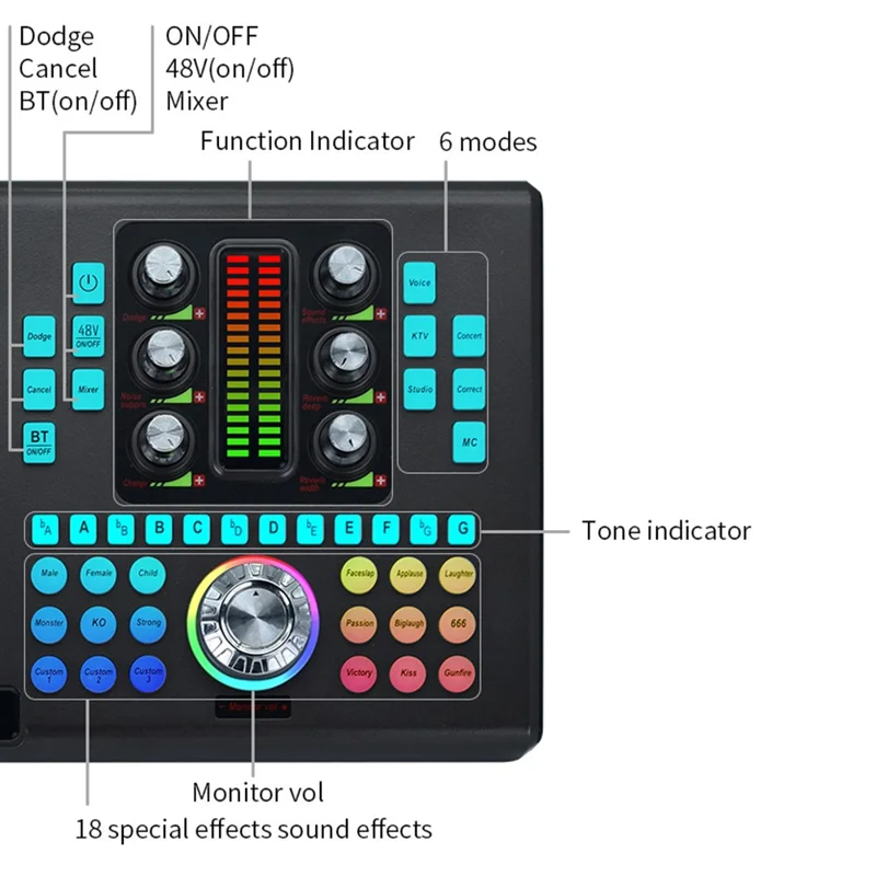 • Supports dual microphones, dual live streaming, and dual headphones. Features adjustable high and low tones, one-touch fade-in, one-touch original sound elimination, one-touch noise reduction, and multiple sets of voice modulation adjustments