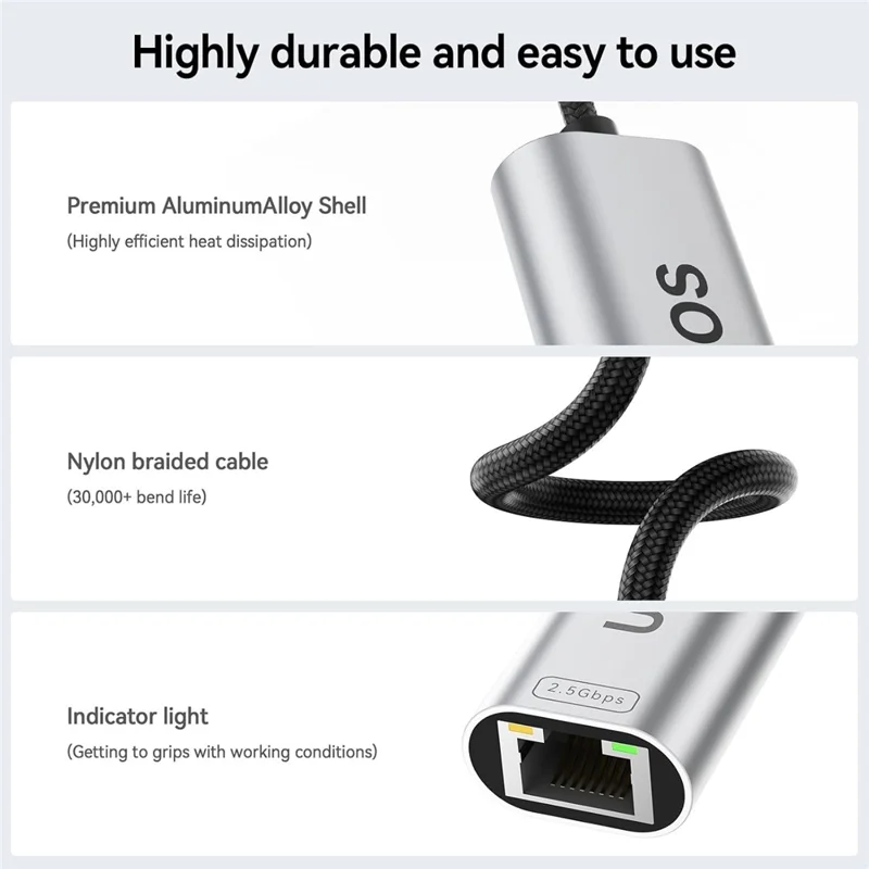【High-Speed 2.5G Ethernet】This USB 3.1 to RJ45 adapter supports up to 2.5Gbps ethernet, providing ultra-fast wired network connectivity for compatible devices