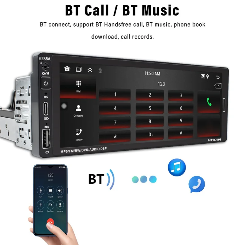 6288A 6.9-inch Single Din Car MP5 Player Wired / Wireless CarPlay Android Auto Video Display
