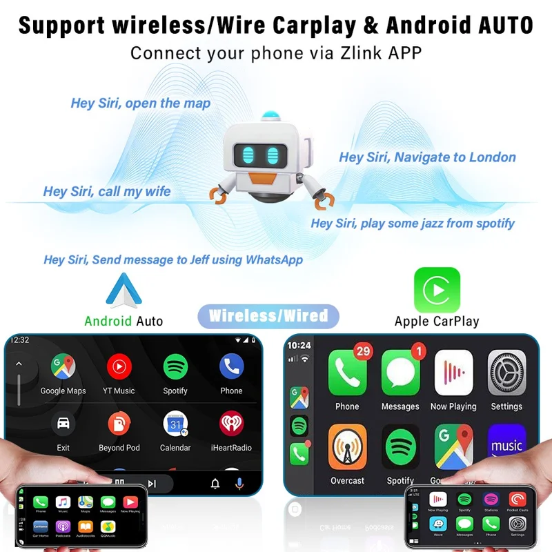 • Wireless Carplay: You can choose a wired connection or a wireless connection for Carplay, connect to your Apple phone, access your phone's address book, emails, notifications, map navigation, music, videos and other information, and implement voice control