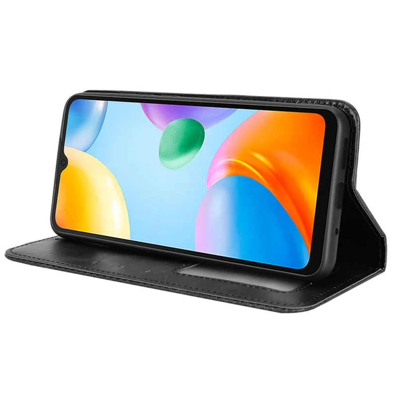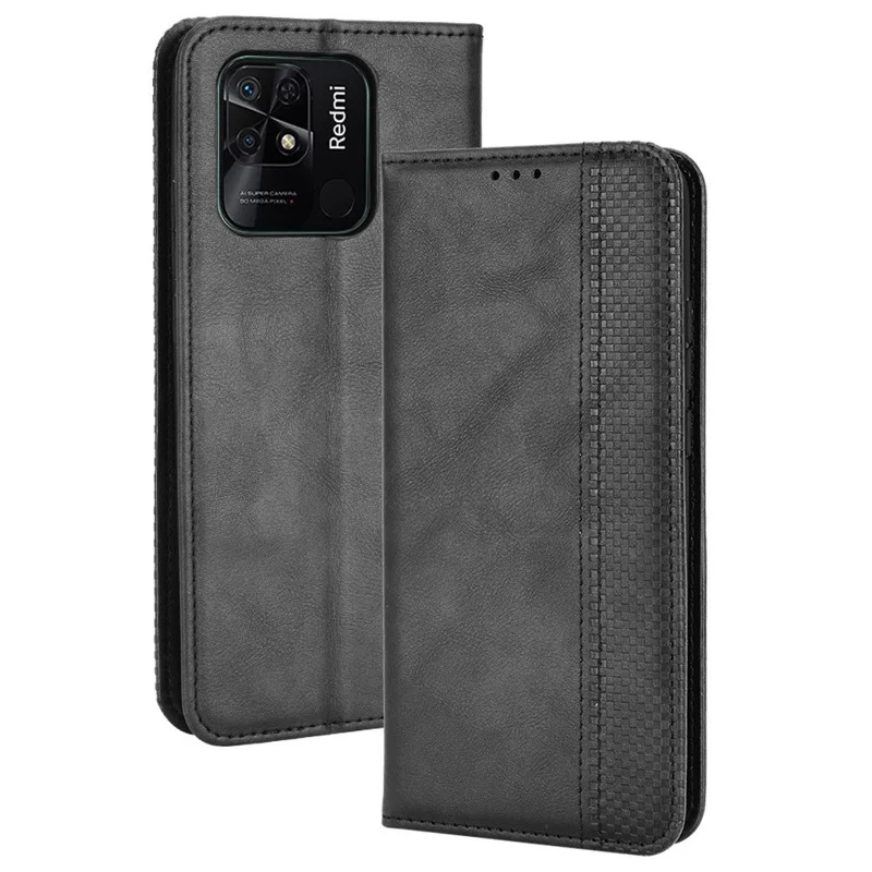 Funda protectora de cuero PU retro para Xiaomi Redmi 10C 4G, funda tipo libro con mosaico impreso, cierre magnético automático, soporte integrado y billetera - Negro
