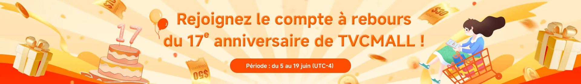 Pendant la période de l'événement du 20 juin au 20 juillet (UTC-4), TVCMALL fait don de $0.17 sur chaque bénéfice de commande à des œuvres caritatives, contribuant ainsi à créer ensemble un avenir meilleur.