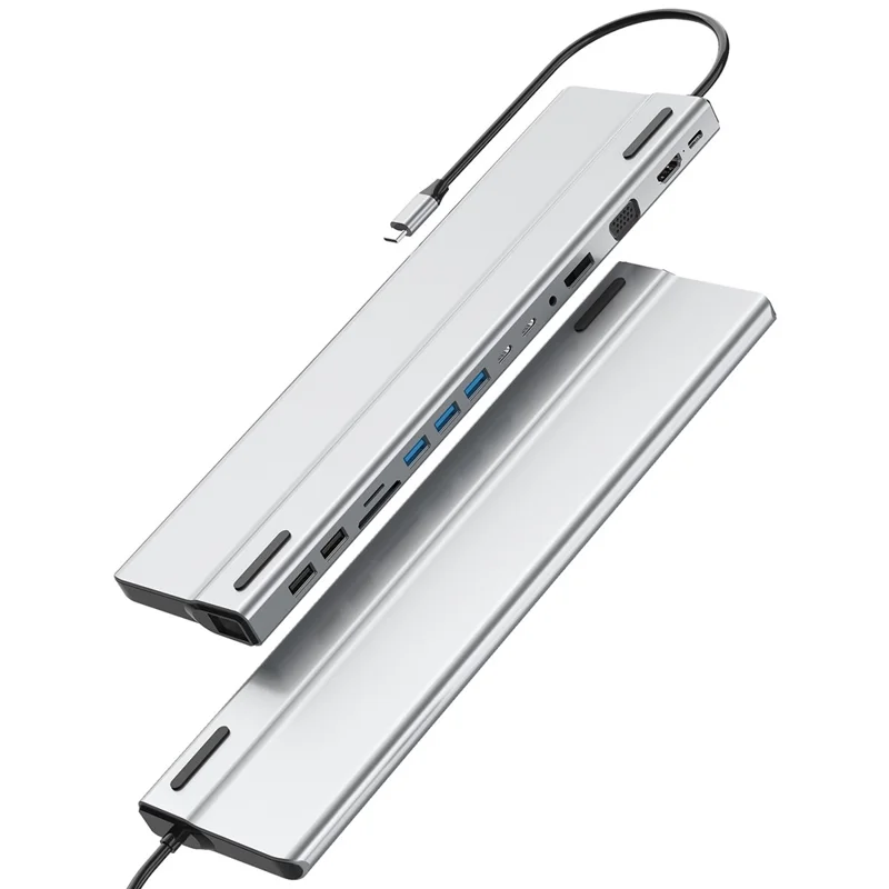 All-in-One 15-in-1 Connectivity: This powerful hub expands your laptop’s capabilities with 15 ports, including dual HD, USB-C, VGA, Ethernet, SD/TF card reader, audio jack, and multiple USB-A ports. It's the perfect solution for professionals who need extensive connectivity in one compact adapter