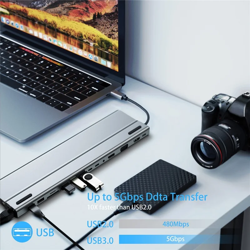 Fast Charging & Data Transfer: The USB-C PD port supports up to 100W of power delivery, ensuring fast charging for your laptop or other devices. Additionally, two USB-C Gen 1 and three USB 3.0 ports provide 5Gbps data transfer speeds, while two USB 2.0 ports ensure compatibility with peripherals like keyboards and mice
