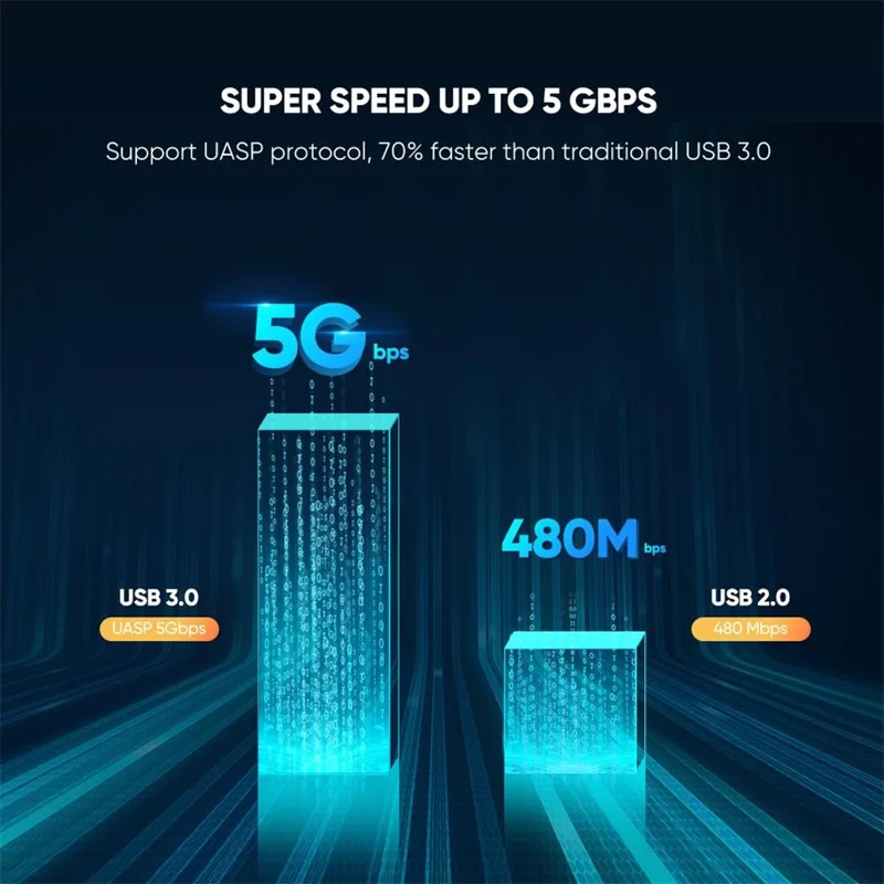 • USB 3.0 & UASP Accelerated: Transfer 1GB file in 3 seconds. The SATA interface of this enclosure supports UASP accelerated transmission protocol, 70% faster than traditional USB 3.0. The USB 3.0 A interface supports up to 5Gbps transfer rate, also backward compatible with USB 2.0 and USB 1.1 ports