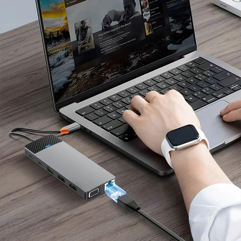 Questo hub Type-C è dotato di USB 3.0*2+USB 2.0*2+PD 100W+USB-C(3.0)+SD/TF(2.0)+Uscita Video HD*2(4K@30Hz)+VGA (1080P)+LAN(1000Gigabit)