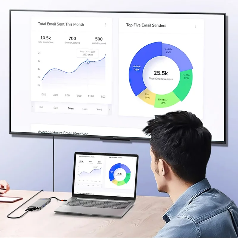 La porta video HD supporta alta risoluzione, consentendoti di collegare un computer, laptop o altri dispositivi con porta USB-C a un monitor, proiettore, HDTV o altri dispositivi con porta video HD per duplicare o estendere il tuo schermo a un monitor più grande