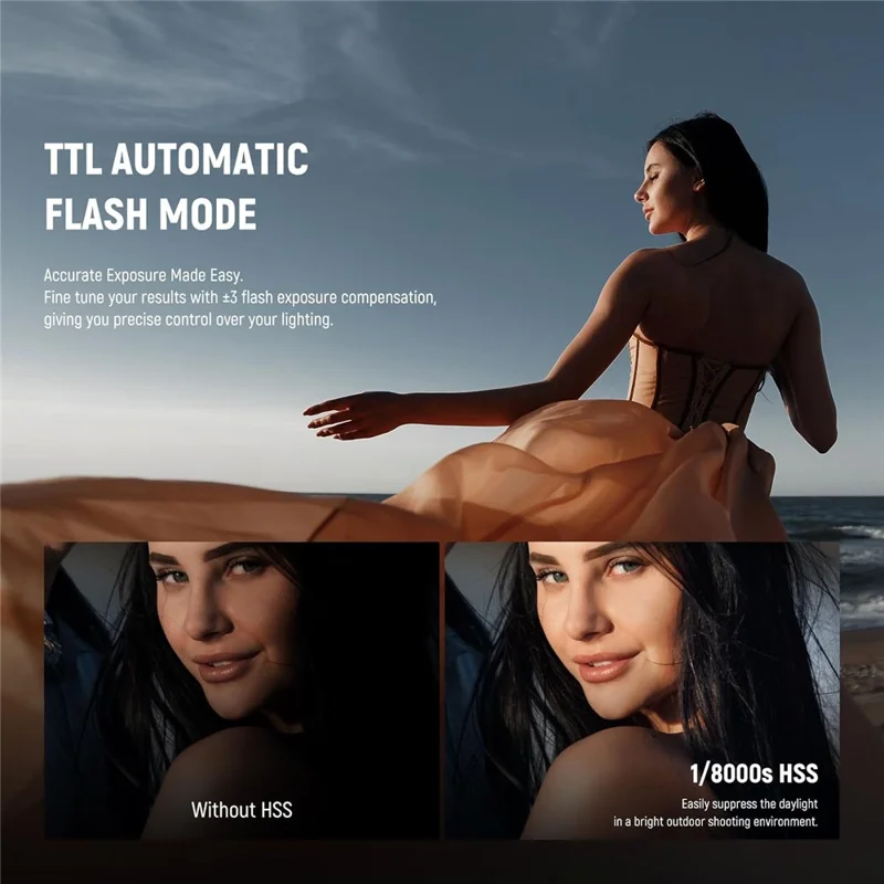 【Advanced Flash Modes】Offers TTL, Manual, and Stroboscopic modes with full support for flash exposure compensation, 1/8000s high-speed sync, and customizable settings.