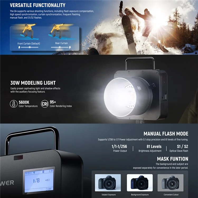 【Long-lasting Battery】The 21.6V/2800mAh lithium battery provides 400 full-power flashes, 0.01-1.2 second recycle time, and 1/209-1/10989 flash duration, ideal for capturing continuous action.
