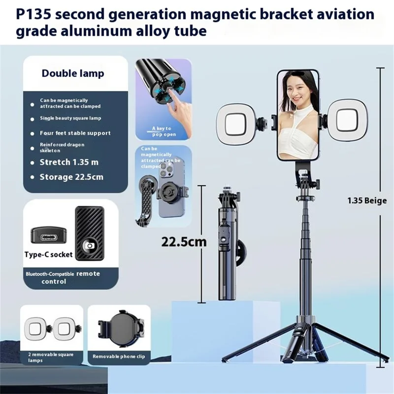 P135 Handheld Phone Selfie Stick Anti-Shake Magnetic Extendable Four-Legged Bracket with 2 Fill Lights - Black